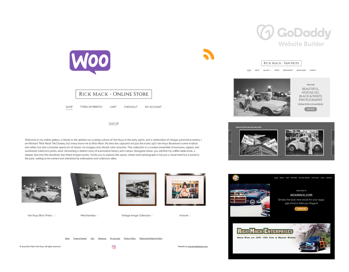 Richard “Rick Mack” McCloskey, an adept craftsman and photographer, operates two distinct business lines: a woodworking enterprise specializing in Woodie Cars and a car-culture photography business, including documenting the 1972 cruising scene on Van Nuys Boulevard. His photography has become iconic and highly collectible, now woven into the cultural history of Los Angeles and Southern California. Rick’s engagement with Macdonald Design LLC was driven by the need to overcome the operational limitations of his previous GoDaddy websites.